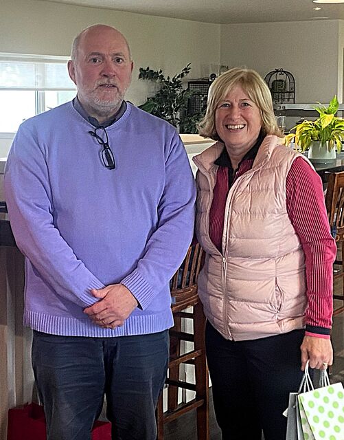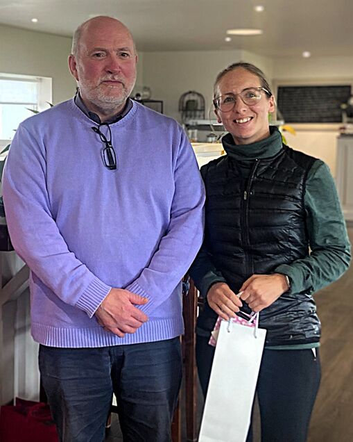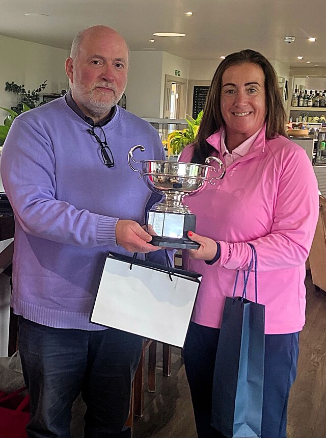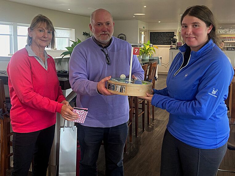 Bessie Cain’s grandson Gavin Cleator - shown above with the winner - helped sponsor the event and attended the clubhouse to present the prizes. He mentioned that Bessie, who was the Ladies Island Champion in1969, loved bogey competitions which was why his family chose this format for the annual memorial Rose Bowl competition.