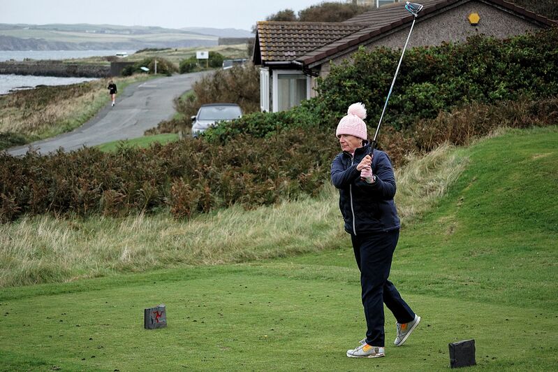 Finishing fourth, the newly crowned club champion Sarah Blackman -shown above- recorded the lowest gross score of 86. She received the longest drive prize for her penetrating punch into the teeth of the wind on the 12th.